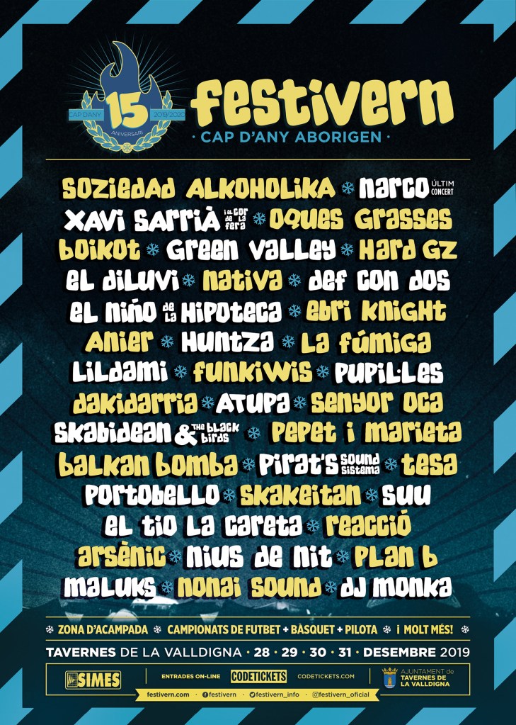 Però no us preocupeu, perquè aquest festival existeix i es diu Festivern! Es celebra a Tavernes de la Valldigna, a les comarques centrals valencianes, i ofereix quatre dies de concerts, d’acampada i d’activitats paral·leles, que fan dels últims dies de l’any els més divertits i esperats. A més, amb uns preus molt assequibles! Les entrades van des dels 20€ als 45€. Força menys del que costen moltes de les discoteques l’única nit del 31 de desembre, i amb l’avantatge que el que es veu i s’escolta és música en viu.